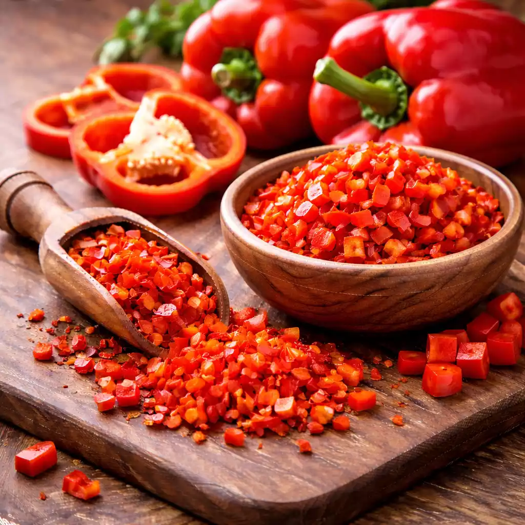 Red bell pepper delivers a mild, sweet, and slightly fruity flavor with soft vegetal undertones.