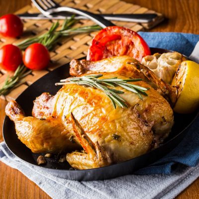 - Place chicken skin-side up on baking sheet. Add lemon slices around the chicken. Roast 35–40 minutes until internal temperature reaches 165°F and skin is crisp.